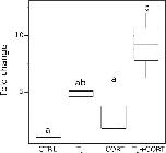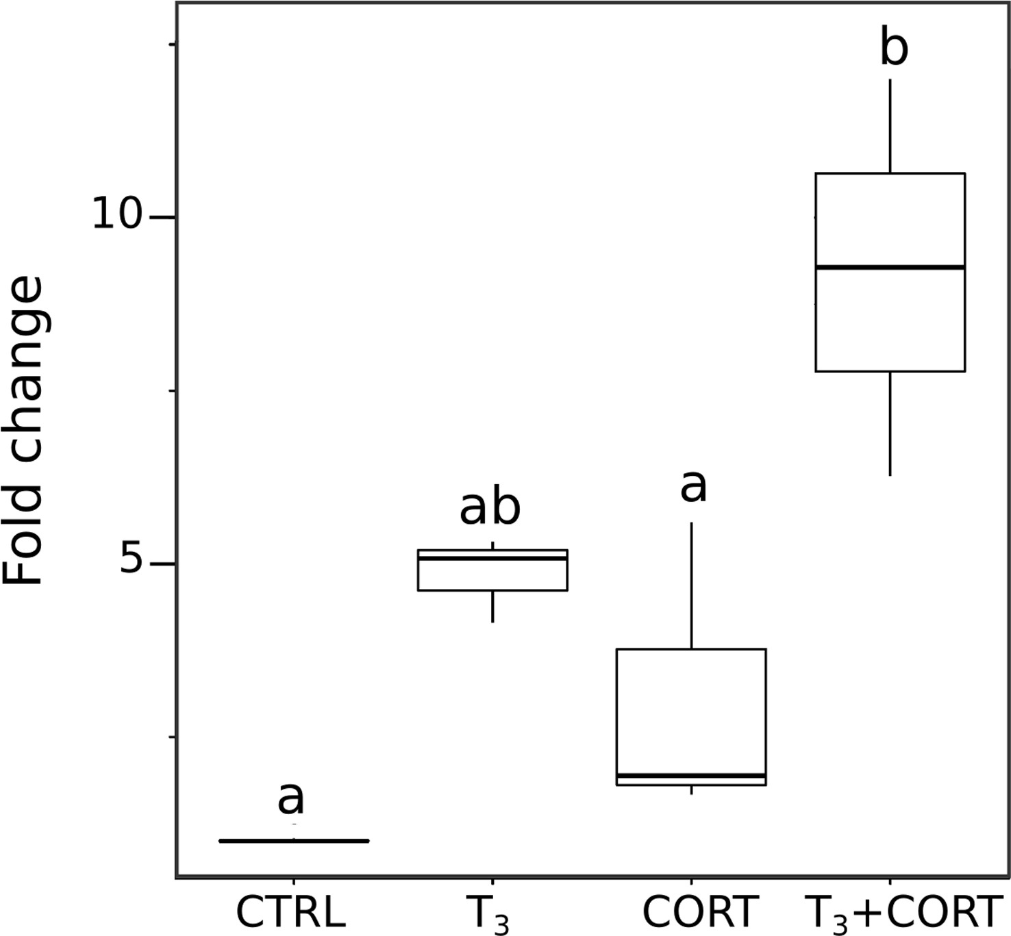 Figure S1. Measure of klf9 gene expression by RT-qPCR. Box plots represent the expression fold change (n = 10/treatment condition). Letters a and b indicate significant differences between the group means based on a Mann-Whitney test. CTRL = control; T3 = 3,3',5-triiodothyronine; CORT = corticosterone; T3+CORT = 3,3',5-triiodothyronine + corticosterone. |