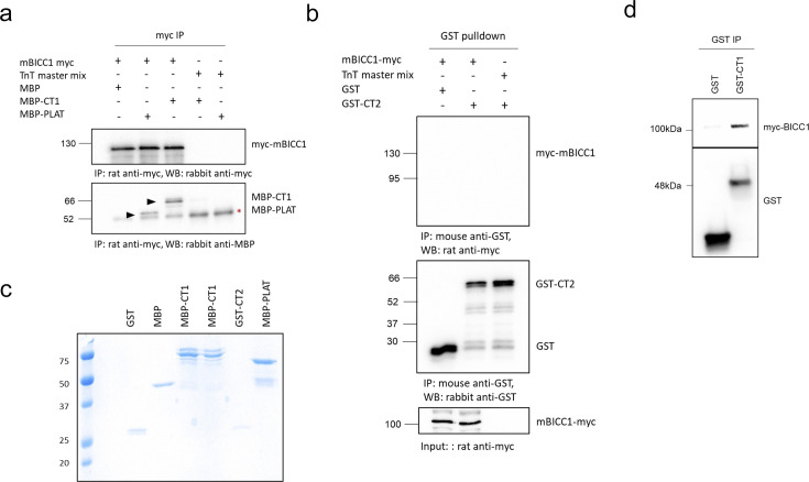 Figure 1—figure supplement 1. In vitro binding assays showing direct binding between Bicc1, PC1-PLAT, and PC1-CT1, but not PC2-CT2.In vitro translated myc-mBicc1 was incubated with recombinant MBP, MBP-PLAT, and MBP-CT1 or GST, GST-CT2 and subjected to IP with an anti-c-myc antibody (a) or pull-down with GST beads (b). MBP or GST was used as a negative control in each respective assay. Arrows indicate the pull down of MBP-PLAT and MBP-CT1, respectively; asterisk indicates non-specific band (a). GST-CT2 did not bind to myc-mBicc1 directly in vitro (b). Quality of the different recombinant proteins used is shown by Coomassie staining (c). GST pull-down identified an interaction between co-expressed GST-CT1 and myc-mBicc1 but not with GST (d).
