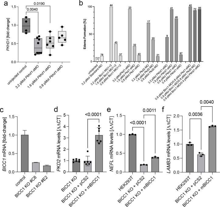 Figure 3—figure supplement 1. Validation of Xenopus knockdowns and BICC1 knockout.(a) qRT-PCR detecting the region targeted by the Pkhd1-sMO using a PrimeTime qPCR assay (IDT). Xenopus embryos were injected with the indicated amount of Pkhd1-sMO and harvested at stage 39 for mRNA extraction. Individual dots indicate pools of five embryos each utilizing three independent fertilizations. Data were analyzed by Mann–Whitney test with one asterisk indicating p≤0.05 and two asterisks indicating p≤0.01. (b) To examine cooperativity between Bicc1 and the PKD genes, each MO was titrated for efficacy alone or tested in combination. Embryos were analyzed for edema formation at stage 43. Data are the accumulation of multiple independent fertilizations with the number of embryos analyzed indicated above each condition. Part of the data is shown in Figure 3j. (c) qRT-PCR for BICC1 comparing wildtype cells to the two genetically engineered BICC1 knockout clones. (d) qRT-PCR for PLD2 shows that re-expression of mBicc1, but not the empty vector (pCS2), restored PKD2 mRNA expression in a HEK293T BICC1 KO clone. (e, f) qRT-PCR for NEFL and LAMB3, which are both downregulated in the HEK293T BICC1 KO clone and restored upon re-expression of mBicc1. |