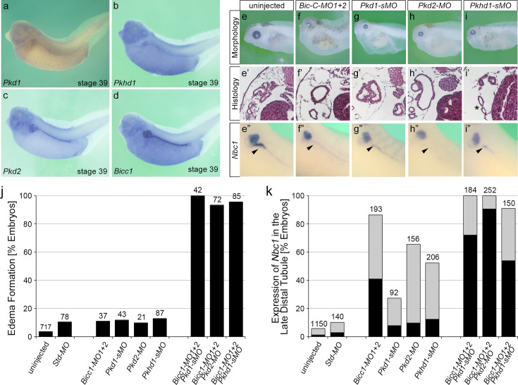 Figure 3. Cooperativity of Bicc1 and PKD genes in Xenopus.(a–d) mRNA expression of Pkd1, Pkhd1, Pkd2, and Bicc1 in the Xenopus pronephros at stage 39. (e–i”) Knockdown of Bicc1 (f–f”), Pkd1 (g–g”), Pkd2 (h–h”), and Pkhd1 (i–i”) by antisense morpholino oligomers (MOs) results in a PKD phenotype compared to uninjected control Xenopus embryos (e–e”). The phenotype is characterized by the formation of edema due to kidney dysfunction (e, f, g, h, i; stage 43), the development of dilated renal tubules (e’, f’, g’, h’, i’; stage 43), and the loss of Nbc1 in the late distal tubule by whole mount in situ hybridizations (arrowheads in e”, f”, g”, h”, i”; stage 39). (j, k) To examine cooperativity, Xenopus embryos were injected with suboptimal amounts of the MOs, either alone or in combination, and analyzed for edema formation at stage 43 (j) and the expression of Nbc1 at stage 39 (k) with gray bars showing reduced and black bars showing absent Nbc1 expression in the late distal tubule. Data are the accumulation of multiple independent fertilizations with the number of embryos analyzed indicated above each condition. |