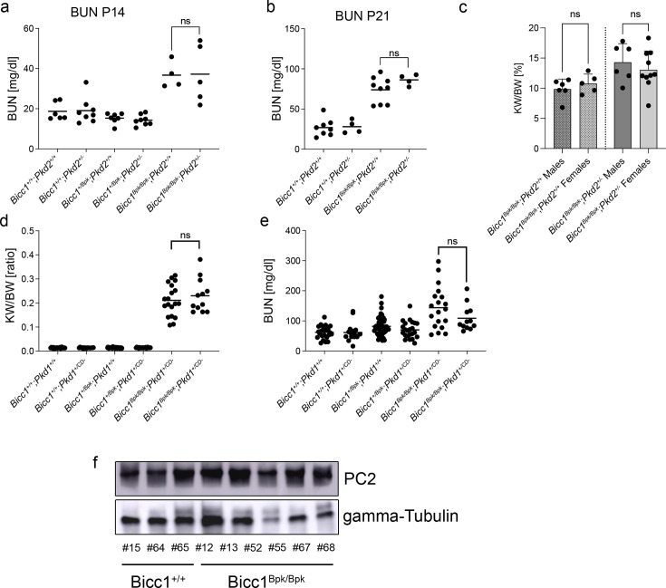 Figure 4—figure supplement 1. Kidney parameters of Bicc1:Pkd2 and Bicc1:Pkd1 compound mutants.(a ,b) Comparison of blood urea nitrogen (BUN) levels of kidneys of the Bicc1:Pkd2 crosses at postnatal day P14 and P21. (c, d) Comparison of kidney weight/body weight ratios (KW/BW) levels of kidneys of Bicc1:Pkd1 crosses and their respective BUN levels at postnatal day P14. (e) Immunoprecipitation of PC2 from kidneys of Bicc1+/+ and Bicc1Bpk/Bpk mice at postnatal day P4. 200 µg total protein from each sample was used to immunoprecipitate PC2 with 5 µg Ycc2 antibody and agarose-bound protein A/G. PC2 was detected using another antibody against Pkd2 (Sc-28331).
