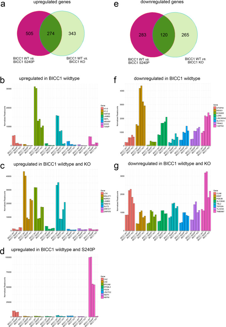 Figure 6—figure supplement 1. Transcriptomic analysis of BICC1 wildtype, BICC1KO, and BICC1-S240P HEK293T cells.(a–g) mRNA-seq data were analyzed using DESeq2 differential expression analysis using two samples per genotype. Venn Diagrams were used to visualize the distribution of the up- or downregulated transcripts (a, e); for each intersection, the eight most significantly altered transcripts (based on their Padj levels) are visualized in a bar diagram showing the normalized expression levels for each sample (b–d, f, g). |
