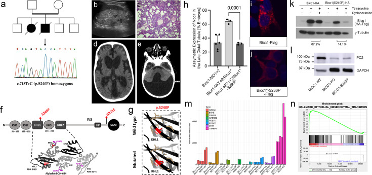 Figure 6. The homozygous BICC1 p.Ser240Pro variant is a hypomorphic cystic disease-causing variant.(a–e) Consanguineous multiplex pedigree with two siblings affected by VEO-ADPKD identified the homozygous BICC1 missense variant c.718T>C (BICC1 p.Ser240Pro) absent from gnomAD and other internal and public databases. Electropherogram is shown in (a). The affected girl presented at a few months of age with renal failure and enlarged polycystic kidneys that lacked corticomedullary differentiation (c). Histology after bilateral nephrectomy showed polycystic kidneys more suggestive of ADPKD than ARPKD without any dysplastic element. Her younger brother exhibited enlarged hyperechogenic polycystic kidneys prenatally by ultrasound (b). In addition, in his early infancy, arterial hypertension and a Dandy–Walker malformation with a low-pressure communicating hydrocephalus were noted (d, e). (f) Ribbon diagram and schematic diagram of BICC1 showing the KH, KHL, and SAM domains. The two BICC1 variants identified in this study, BICC1 p.Ser240Pro (S240P) and BICC1 p.Gly821Glu (G821E) are indicated in red. (g) Solid boxes correspond to local impacts of p.Ser240Pro (p.S240P) on BICC1 structure, interactions are labeled as dashed lines (pseudobonds). GXXG motifs colored in magenta, representative missense variant residues colored in red and residues adjacent to selected variant (<5 Å) colored in tan. (h) Rescue experiments of Xenopus embryos lacking BicC1 by co-injections with the wild type or mutant constructs. Embryos were scored for the re-expression of Nbc1 in the late distal tubule by whole mount in situ hybridizations. Quantification of at least 3 independent experiments is shown. (i, j) HEK293T cells were transfected with Flag-tagged constructs of wild type or mutant Bicc1 and the subcellular localization of Bicc1 was visualized (red). Nuclei were counterstained with DAPI (blue). (k) Protein stability analysis using tetracycline-inducible HEK293T cells comparing the expression levels of Bicc1 and Bicc1-S240P 24 hours after removal of tetracycline and addition of cycloheximide. γ-Tubulin was used as loading control. The percentage of protein destabilization because of protein synthesis inhibition by cycloheximide is indicated. (l) Western Blot analysis of wildtype HEK293T, cells lacking BICC1 (BICC1-KO) and isogenic cells with the BICC1 p.Ser240Pro (BICC1-S240P) variant for PC2 expression. GAPDH was used as loading control. (m, n) Bar graph of the mRNA-seq transcriptomic analysis comparing BICC1 wildtype, knockout, and S240P isogenic HEK293T cells showing the eight most significantly upregulated transcripts (based on their Padj levels) in the BICC1 KO cells (m). For each gene, the normalized expression levels from each of the 6 samples (2 wildtype, KO, and 240 P each) are shown. (n) GSEA plot showing the enrichment of the Hallmark Epithelial_Mesenchymal_Transition data set in the BICC1-KO cells vs. the BICC1-S240P cells.