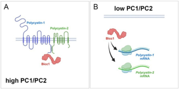 Author response image 1. Model of BICC1, PC1 and PC2 self-regulation.In this model Bicc1 acts as a positive regulator of PKD gene expression. In the presence of ‘sufficient’ amounts of PC1/PC2 complex, it is tethered to the complex and remains biologically inactive (Fig. 1A). However, once the levels of the PC1/PC2 complex are reduced, Bicc1 is now present in the cytoplasm to promote expression of the PKD proteins, thereby raising their levels (Fig. 4B), which then in turn will ‘shutdown’ Bicc1 activity by again tethering it to the plasma membrane. |