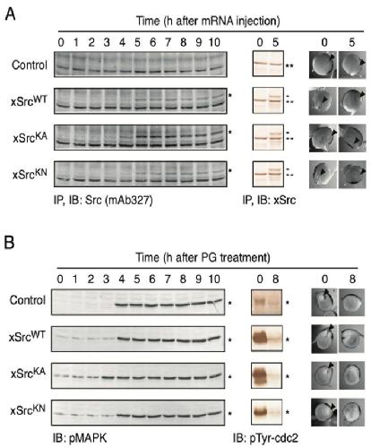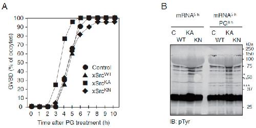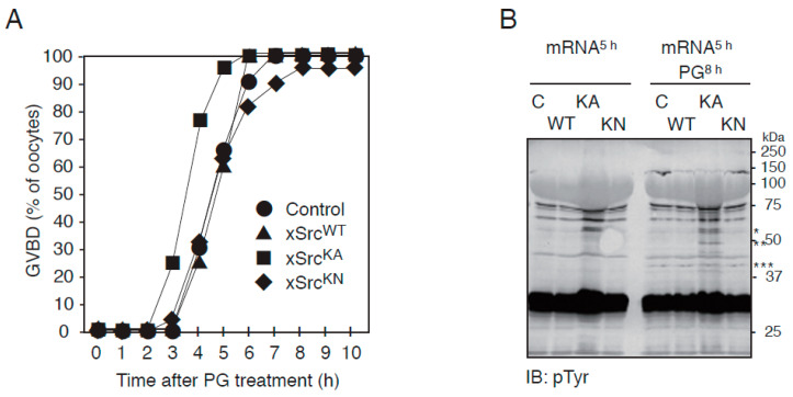 Figure 3. Acceleration of progesterone-induced GVBD and increased tyrosine phosphorylation in oocytes expressing constitutively active xSrc. (A) Time course of GVBD in control oocytes and those expressing xSrcWT, xSrcKA, or xSrcKN. Oocytes expressing the constitutively active mutant xSrcKA displayed a modest but reproducible acceleration in GVBD onset compared with other groups. The percentage of GVBD was assessed at 1 h intervals following progesterone treatment. (B) Anti-phosphotyrosine immunoblot showing progesterone-induced tyrosine phosphorylation of multiple proteins. Oocytes expressing xSrcKA exhibited increased phosphorylation of several proteins relative to controls and other Src constructs. A strongly phosphorylated ∼50 kDa protein (**), distinct from recombinant xSrc itself (∼60 kDa; *) and MAPK (∼42 kDa; ***), was specifically enhanced in xSrcKA-expressing oocytes. This suggests the presence of an unidentified substrate whose phosphorylation is stimulated by elevated Src kinase activity.