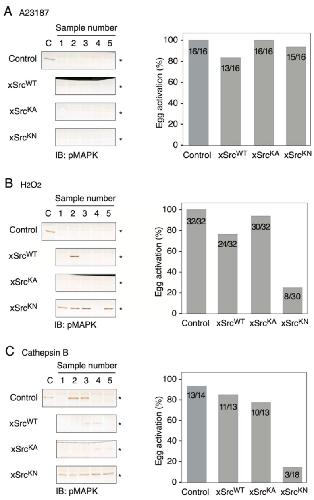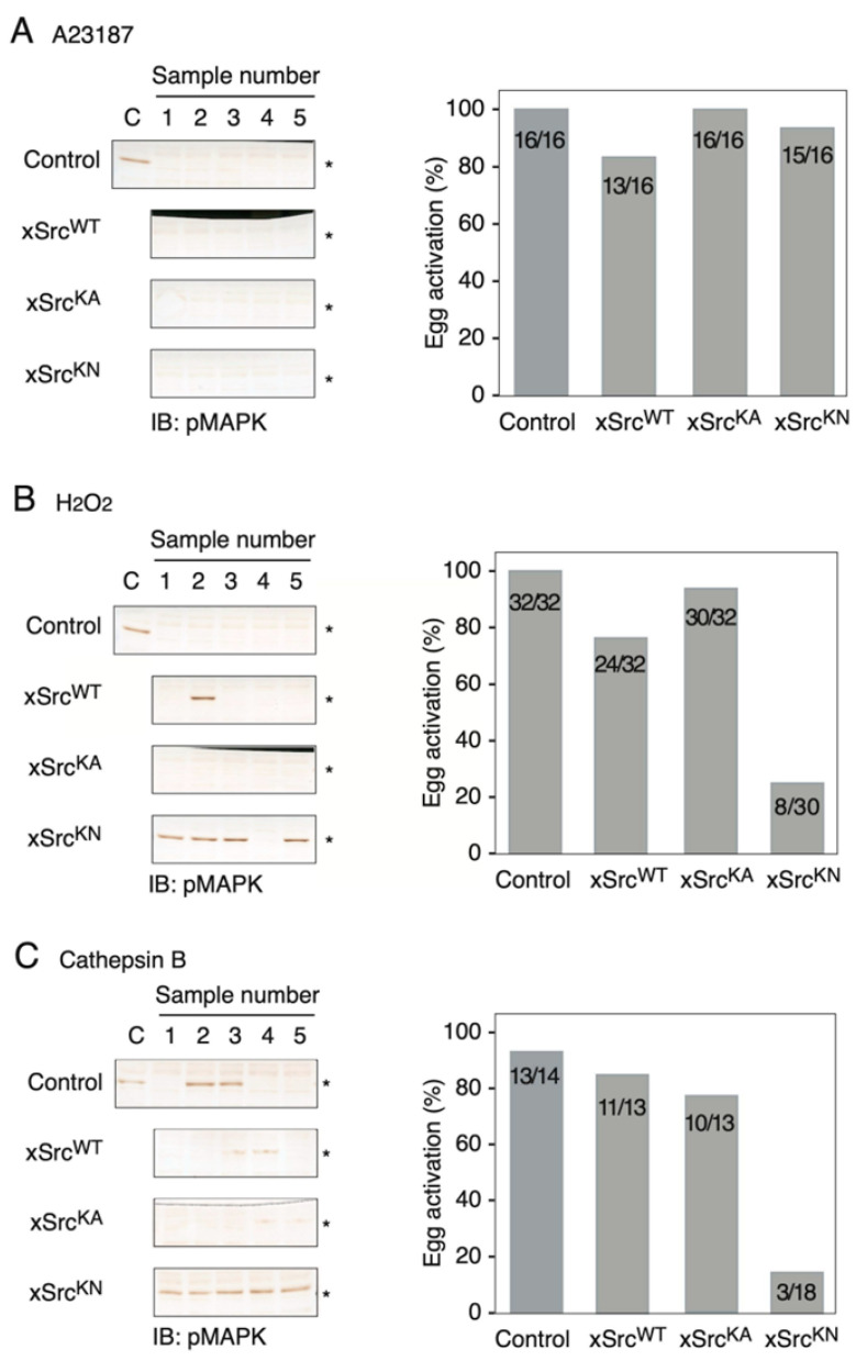Figure 4. Differential requirements for Src kinase activity during egg activation induced by A23187, H2O2, or Cathepsin B. Matured oocytes (mRNA injection for 5 h + progesterone treatment for 8 h) were subjected to the indicated activation stimuli. (A) A23187-induced activation. Left: MAPK dephosphorylation assessed by anti-pMAPK immunoblotting. Right: Percentage of oocytes undergoing cortical contraction. All three xSrc-expressing groups activated efficiently, similar to controls, indicating that Src kinase activity is not required for Ca2+-ionophore-induced activation. (B) H2O2-induced activation. Left: MAPK dephosphorylation profiles. Right: Quantification of cortical contraction. xSrcKN-expressing oocytes showed markedly reduced activation compared to control, xSrcWT, and xSrcKA oocytes. (C) Cathepsin B-induced activation. Left: MAPK dephosphorylation following Cathepsin B treatment. Right: Activation rates based on cortical contraction. As with H2O2, xSrcKN-expressing oocytes displayed a strong reduction in responsiveness, demonstrating the requirement of Src kinase activity in membrane-associated activation signaling. In all panels, asterisks (*) indicate the positions of pMAPK.