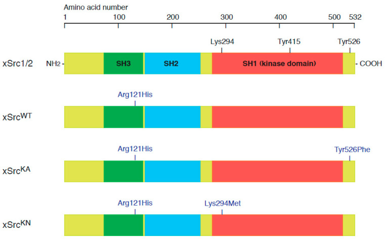 Figure 1. Schematic representation of wild-type and mutant X. laevis Src (xSrc) constructs used for expression in oocytes. The full-length xSrc2 protein (accession no. NP_001080738.1) contains three conserved domains: SH3, SH2, and SH1 (kinase domain), with critical regulatory residues Lys294 (ATP-binding site), Tyr415 (autophosphorylation site), and Tyr526 (C-terminal inhibitory phosphorylation site). Three expression constructs were generated: wild type (xSrcWT), constitutively active (xSrcKA, Tyr526Phe), and kinase-negative (xSrcKN, Lys294Met). To enable immunochemical detection distinct from endogenous Src proteins, all constructs included a common Arg121His substitution within the SH3 domain, which renders the recombinant proteins specifically recognizable by the monoclonal antibody mAb327 (anti-human/mouse/chicken Src).