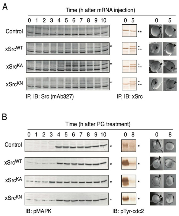 Figure 2. Time-dependent expression of recombinant xSrc proteins in X. laevis oocytes following mRNA microinjection, and progesterone-induced MAPK activation, CDK1/Cdc2 dephosphorylation, and GVBD occur normally in oocytes expressing recombinant xSrc proteins. (A) Left panels: Recombinant xSrc proteins, as indicated by asterisks (*), were detected by immunoprecipitation (IP) using mAb327 followed by immunoblotting (IB). All constructs became detectable approximately 4–5 h after mRNA injection. Middle panels: Total Src protein levels were examined using an antibody that recognizes both endogenous (**) and recombinant xSrc (*). Recombinant xSrc proteins were expressed at levels comparable to or higher than endogenous Src. Right panels: Representative bright-field images of oocytes at 0 h and 5 h after mRNA injection. No changes in surface pigmentation or germinal vesicle morphology were observed, indicating that forced expression of xSrc constructs did not induce premature maturation or morphological abnormalities. (B) Left panels: Immunoblotting for phosphorylated MAP kinase (pMAPK), as indicated by asterisks (*), showing time-dependent activation following exposure to 2 µM progesterone. Middle panels: Immunoblotting for CDK1/Cdc2 phosphorylated on the inhibitory tyrosine residue (pTyr-Cdc2), as indicated by asterisks (*). Dephosphorylation indicates activation of CDK1 and progression toward GVBD. Right panels: Representative images of oocytes at 0 h and 8 h after progesterone treatment. GVBD, visualized as disappearance of the germinal vesicle (arrowheads), occurred in all groups—including xSrcWT-, xSrcKA-, and xSrcKN-expressing oocytes—with kinetics similar to those of control oocytes. Together, these results indicate that forced expression of recombinant xSrc proteins, regardless of kinase activity, does not interfere with the hormonal maturation program of immature oocytes.