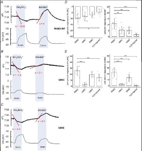 A light blue rectangle indicates the period when the oocyte was perfused with testing solutions containing either NH3/NH4+ or MA/MA+. STD Hepes represent the time when the oocyte was perfused with control solution (Hepes). Black and grey tracings represent the measurements conducted on the oocyte expressing WT-RhBG or on the oocyte injected with water as a control, respectively. Each tracing is a single representative experiment. All changes observed were reversed upon removal of test solutions. nA, nanoamp; Vm, membrane potential; mV, millivolt; Δ, measurement difference (end value minus initial value); slope =