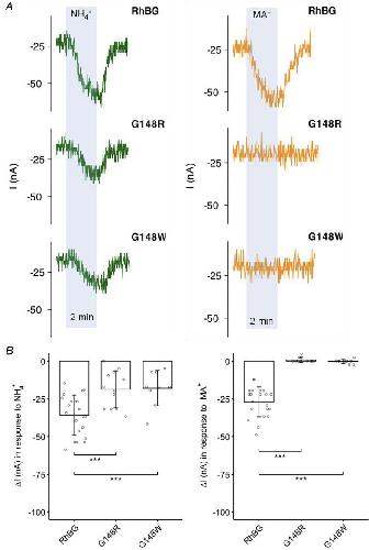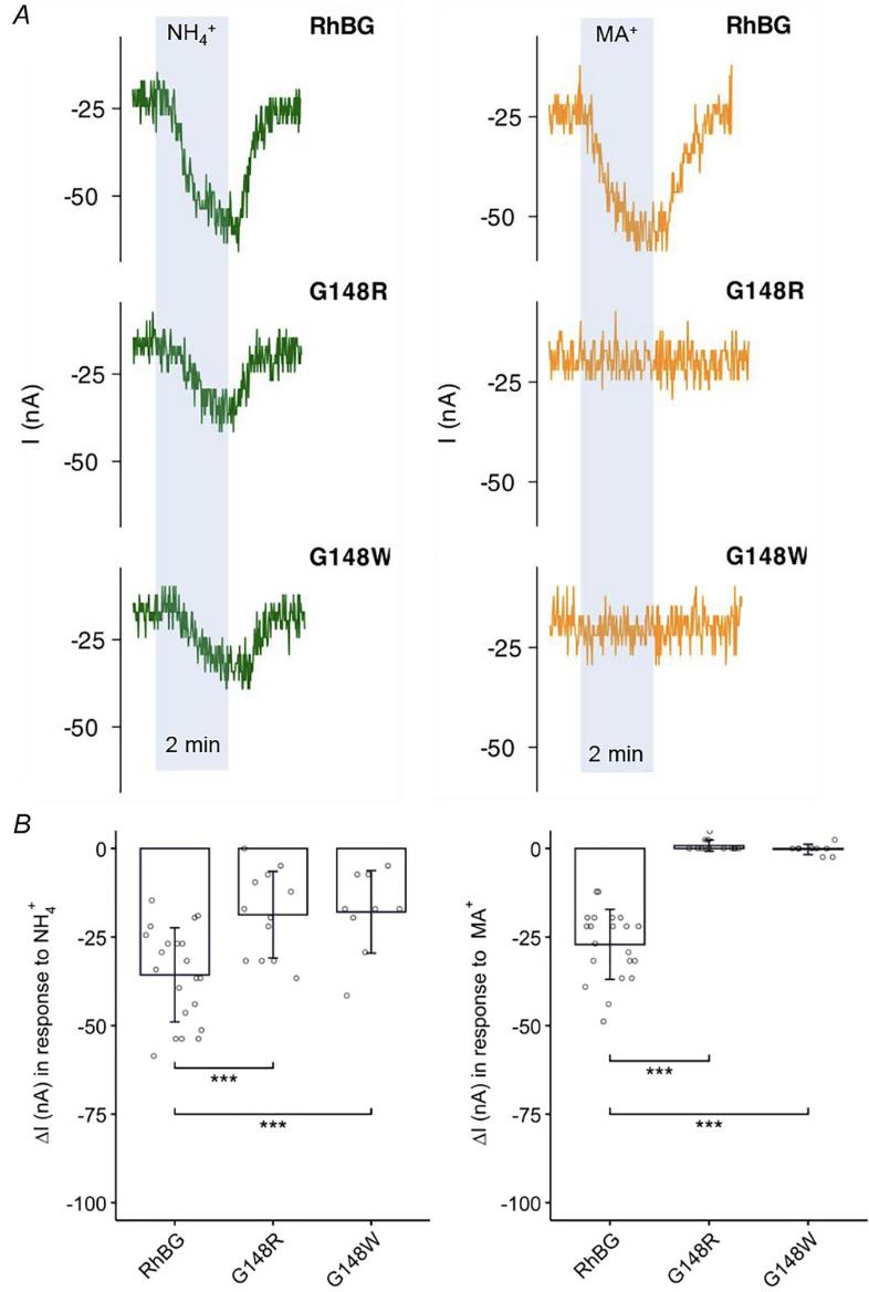 A, tracings of NH4+- (green) and MA+-induced (orange) currents (I) of G148W and G148R mutations compared to WT-RhBG. B, bar plot of current changes (ΔI) induced by NH4+ (left) and MA+ (right), in WT-RhBG and G148W/R mutants respectively. Error bars were created using the SD. Individual data points represent individual oocyte measurements pooled from three independent injection batches after outlier removal. RhBG, N = 21; G148W, N = 9; G148R, N = 12. ***P < 0.001. Statistical significance of multiple comparisons by mixed-effects models was corrected using the false discovery rate method. For P values, see Table 5. |
