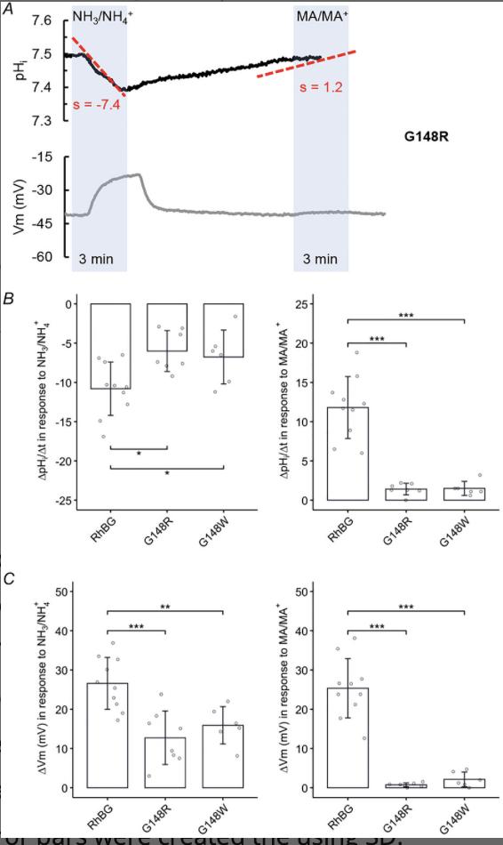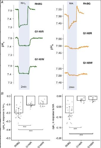 A, tracings of NH3-induced (green) and MA-induced (orange) pHs changes of G148W and G148R mutations compared to WT-RhBG. B, bar plot of pHs changes (ΔpHs) induced by NH3 (left) and MA (right), respectively. Error bars were created using the SD. Individual data points represent individual oocyte measurements pooled from three independent injection batches after outlier removal. RhBG, N = 29; G148W, N = 10; G148R, N = 10. ***P < 0.001. Statistical significance of multiple comparisons by mixed-effects models was corrected using the false discovery rate method. For P values, see Table 5. |