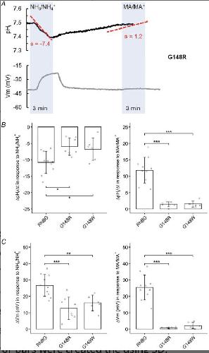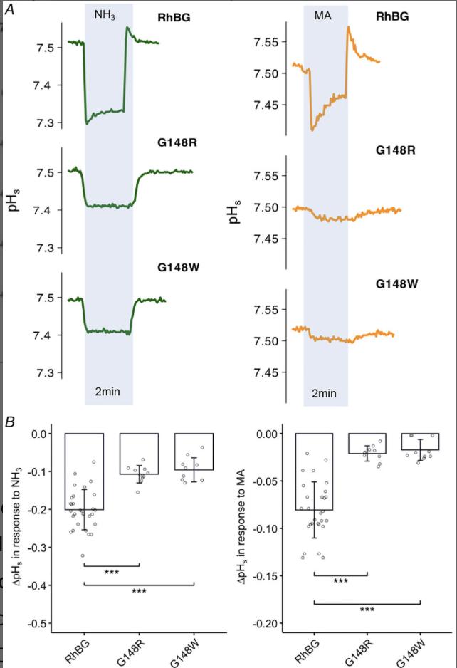 Figure 6. Effects of G148W/R on pHs induced by NH3 and MA