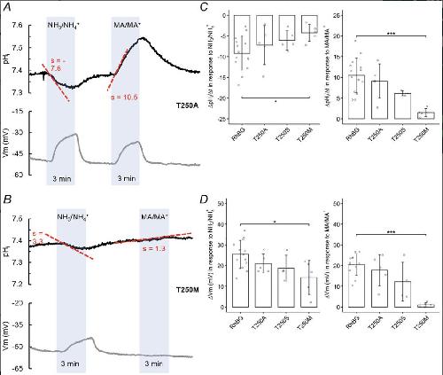 Figure 9. Effects of T250A/S/M on pHs induced by NH3 and MA