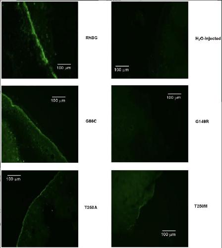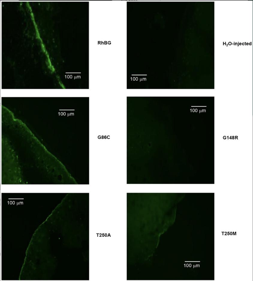 RhBG, T250A and G86C-expressing oocytes showed positive staining on the cell membrane. Labelling of T250M was weak at the cell membrane. No labelling was detected in G148R and H2O-injected oocytes. |