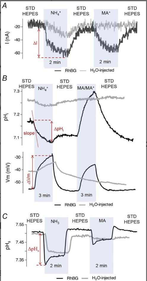Figure 1. Measurements in oocytes (WT-RhBG vs. H2O) exposed to NH3/NH4+ or MA/MA+