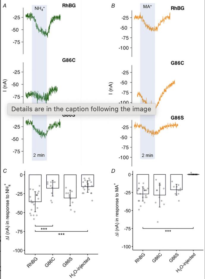 A, NH4+-induced current (I) in oocytes expressing G86C and G86S mutations compared to WT-RhBG. B, typical tracings of MA+-induced current of oocytes expressing G86C and G86S mutations compared to WT-RhBG. C and D, bar plots of current change (ΔI) induced by NH4+ and MA+, respectively. Error bars were created using the SD. Individual data points represent individual oocyte measurements pooled from three independent injection batches after outlier removal. RhBG, N = 21; G86C, N = 11; G86S, N = 10; H2O-injected, N = 21. ***P < 0.001. Statistical significance was adjusted for multiple comparisons using the false discovery rate method. Bar plots were adapted from multiple comparison tests and broken into separate plots based on mutation groups for clear illustration. For P values, see Table 5. |