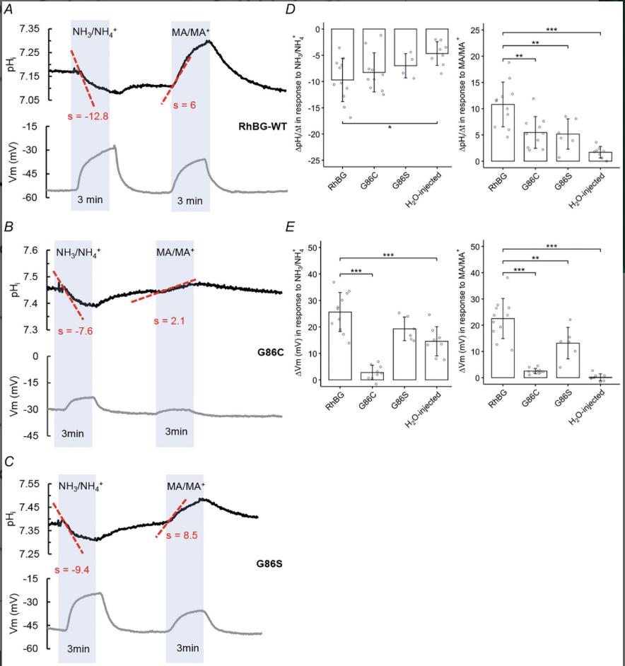 × 104). A, effect of NH3/NH4+ and MA/MA+ on pHi in oocytes expressing human RhBG wild type (WT-RhBG). Exposure to 5 mm NH3/NH4+ caused a rapid acidification (a decrease in pHi) with a slope of −12.8 and depolarization of the cell membrane. Exposure to MA/MA+ also caused cell membrane depolarization but pHi alkalinization. B, effect of NH3/NH4+ and MA/MA+ on pHi in oocytes expressing mutant RhBGG86C. Exposure to 5 mM NH3/NH4+ induced a rapid acidification (slope = −7.6) but a small depolarization of the cell membrane (ΔVm = 6.9 mV). Exposure to MA/MA+ caused slight alkalinization of pHi but only a limited depolarization of the cell membrane (ΔVm = 2.7 mV) compared to the oocytes expressing WT-RhBG. The steady state of Vm in RhBGG86C-expressing oocytes is relatively low (Vm = −30 mV) compared to oocytes expressing WT-RhBG or other RhBG mutants (Vm < −45 mV). C, effect of NH3/NH4+ and MA/MA+ on pHi in oocytes expressing mutant RhBGG86S. Exposure to 5 mm NH3/NH4+ caused an acidification (slope = −9.4) and a depolarization of the cell membrane (ΔVm = 24 mV), which are not different from RhBG expressing oocytes (P > 0.05). Exposure to MA/MA+ also caused a small alkalinization in pHi (P < 0.01) and a small depolarization of the cell membrane (ΔVm = 13.6 mV, P < 0.01) compared to the oocytes expressing WT-RhBG. D, bar plot of the rates of change of pHi (slope) in oocytes exposed to NH3/NH4+ (left) and MA/MA+ (right), respectively. E, bar plot of Vm changes (ΔVm) when oocytes are exposed to NH3/NH4+ (left) and MA/MA+ (right), respectively. Error bars were created using the SD. Individual data points represent individual oocyte measurements pooled from three independent injection batches after outlier removal. RhBG, N = 11; G86C, N = 10; G86S, N = 6; H2O-injected, N = 8. ***P < 0.001; **P < 0.01; *P < 0.05. Statistical significance of multiple comparisons by mixed-effects models was corrected using the false discovery rate method. For P values, see Table 5. |