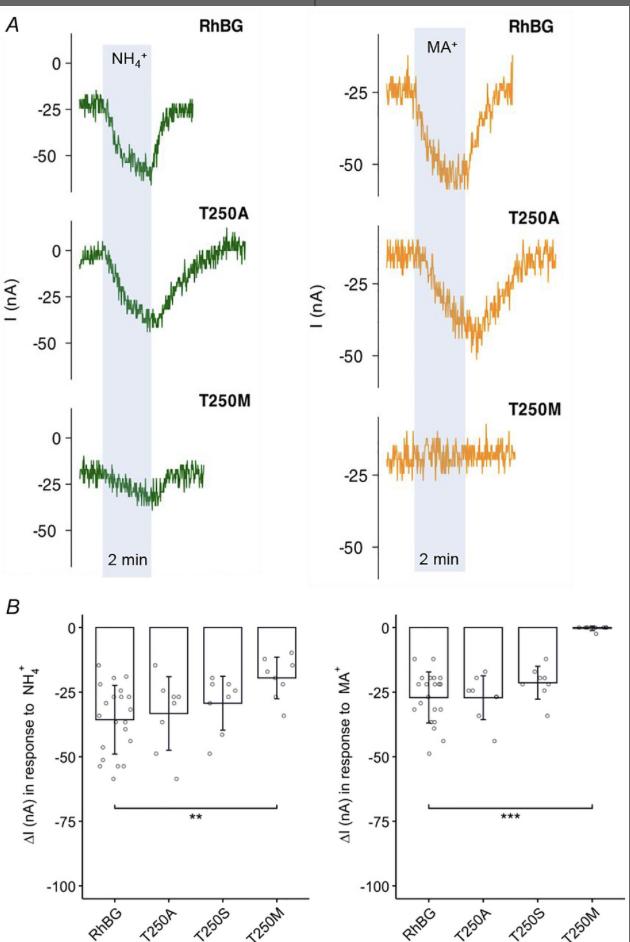 A, NH4+-induced (green) and MA+-induced (orange) current (I) in tracings for T250A and T250M mutations compared to WT. The tracing of T250S resembles T250A (tracing not shown). B, bar plot of current change (ΔI) induced by NH4+ (left) and MA+ (right), respectively. Error bars were created using the SD. Individual data points represent individual oocyte measurements pooled from three independent injection batches after outlier removal. RhBG, N = 21; T250A, N = 8; T250S, N = 8; T250M, N = 8. ***P < 0.001; **P < 0.01. Statistical significance of multiple comparisons by mixed-effects models was corrected using the false discovery rate method. For P values, see Table 5. |
