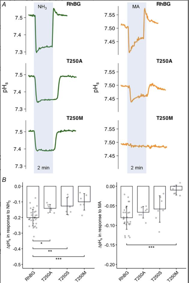 A, NH3-induced (green) and MA-induced (orange) pHs changes in tracings for T250A and T250M mutations compared to WT. The tracing of T250S resembles T250A (tracing not shown). B, bar plot of pHs changes (ΔpHs) induced by NH3 (left) and MA (right), respectively. Error bars were created using the SD. Individual data points represent individual oocyte measurements pooled from three independent injection batches after outlier removal. RhBG, N = 29; T250A, N = 7; T250S, N = 7; T250M, N = 6. ***P < 0.001; **P < 0.01; *P < 0.05. Statistical significance of multiple comparisons by mixed-effects models was corrected using the false discovery rate method. For P values, see Table 5. |