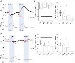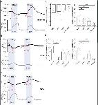 A, in RhBGT250A, exposure to 5 mM NH3/NH4+ caused a decrease in pHi and depolarization of the cell membrane. Exposure to MA/MA+ caused pH alkalinization and a depolarization of the cell membrane. The results of those measurements are not different from those in oocytes expressing WT-RhBG (P > 0.05). Effects of NH3/NH4+ and MA/MA+ on pHi in RhBGT250S-expressing oocytes (tracing not shown) showed a similar pattern to RhBGT250A. B, in oocytes expressing RhBG mutant T250M, exposure to 5 mMM NH3/NH4+ caused a slow acidification (P < 0.05) and a small depolarization of the cell membrane (P < 0.05) compared to oocytes expressing WT-RhBG. Exposure to MA/MA+ caused a much slower increase in pHi (slope = 1.3, P < 0.001) and no depolarization of the cell membrane (P < 0.001) compared to oocytes expressing WT-RhBG. C, bar plot summarizing the rates of pHi changes (slope) in oocytes exposed to NH3/NH4+ (left) and MA/MA+ (right), respectively. D, bar plot of Vm change (ΔVm) in oocytes exposed to NH3/NH4+ (left) and MA/MA+ (right), respectively. Error bars were created using the SD. Individual data points represent individual oocyte measurements pooled from three independent injection batches after outlier removal. RhBG, N = 14; T250A, N = 5; T250S, N = 5; T250M, N = 5. ***P < 0.001; *P < 0.05. Statistical significance of multiple comparisons by mixed-effects models was corrected using the false discovery rate method. For P values, see Table 5. |