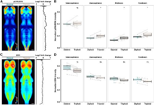 (A) Heatmap showing normalized, averaged pERK/ERK intensity of 27 diploid and 26 triploid brains of unstimulated, freely swimming stage 46 tadpoles from six independent clutches. Log2 fold changes (triploid/diploid) of pERK/ERK intensity along the y axis are plotted to the right. Scale bar, 100[[micrometers]]. See also Figure S6 for pERK expression patterns and response to stimuli.