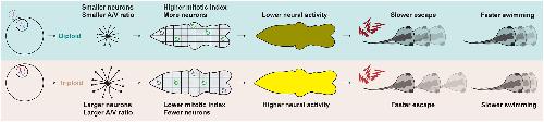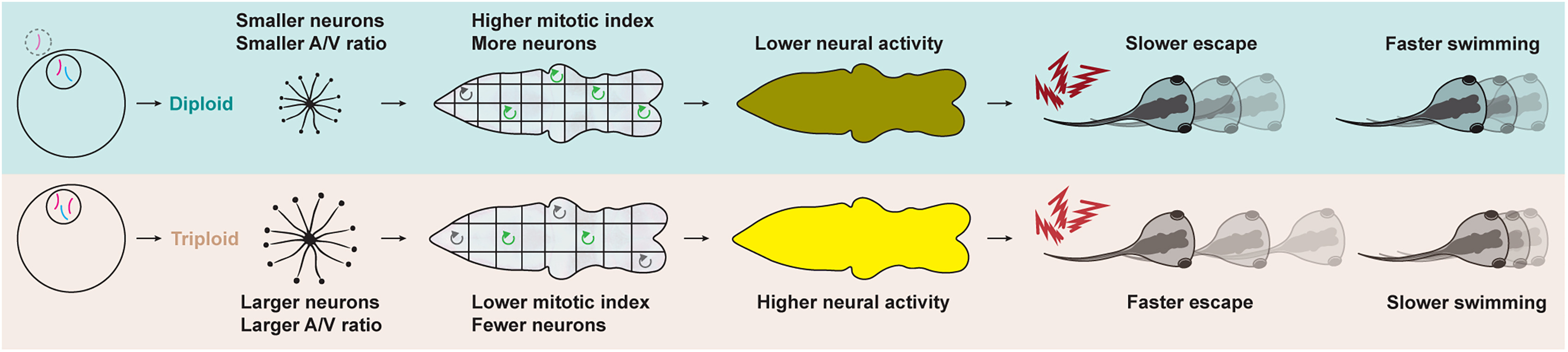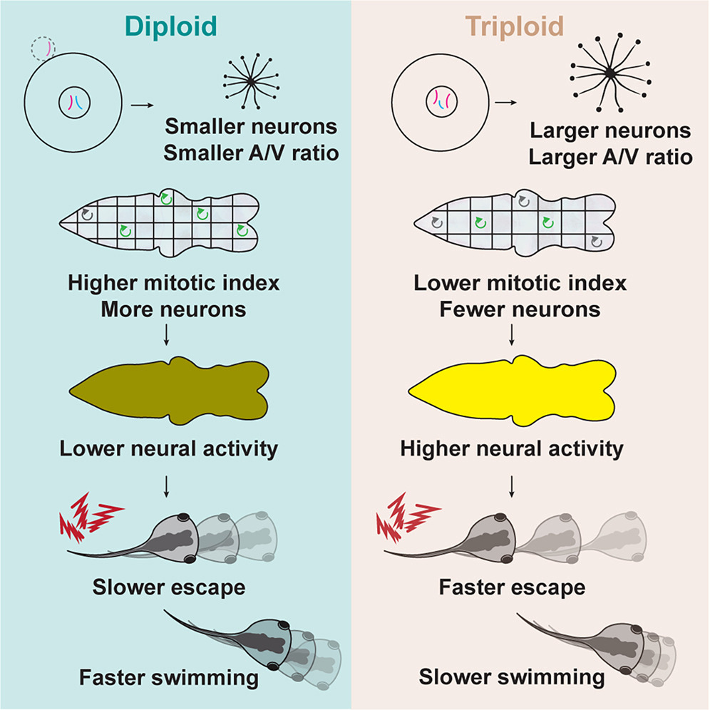 Figure 6 Neuron size and brain physiology differences produce distinct swimming behaviors in triploid tadpoles