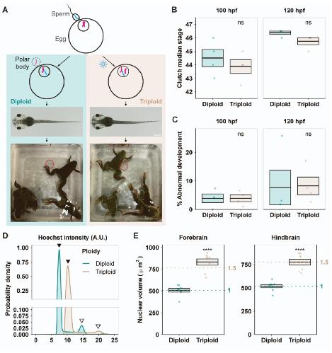 (B–C) Developmental stage (B) and percentage of embryos with gross abnormalities (C) of diploid and triploid clutch mates at the indicated hours post-fertilization (hpf). Each dot represents the median of one clutch. >300 tadpoles per ploidy per time point from 4 independent clutches were examined. Abnormal-looking tadpoles