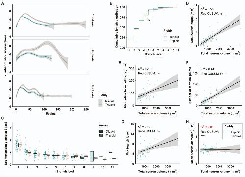 (A) Sholl analyses of diploid and triploid neurons in the indicated brain regions. The same neurons were used as in Figures 2C. Data were smoothed with a generalized additive model (GAM) and were presented as mean +/- 95% confidence interval.