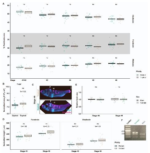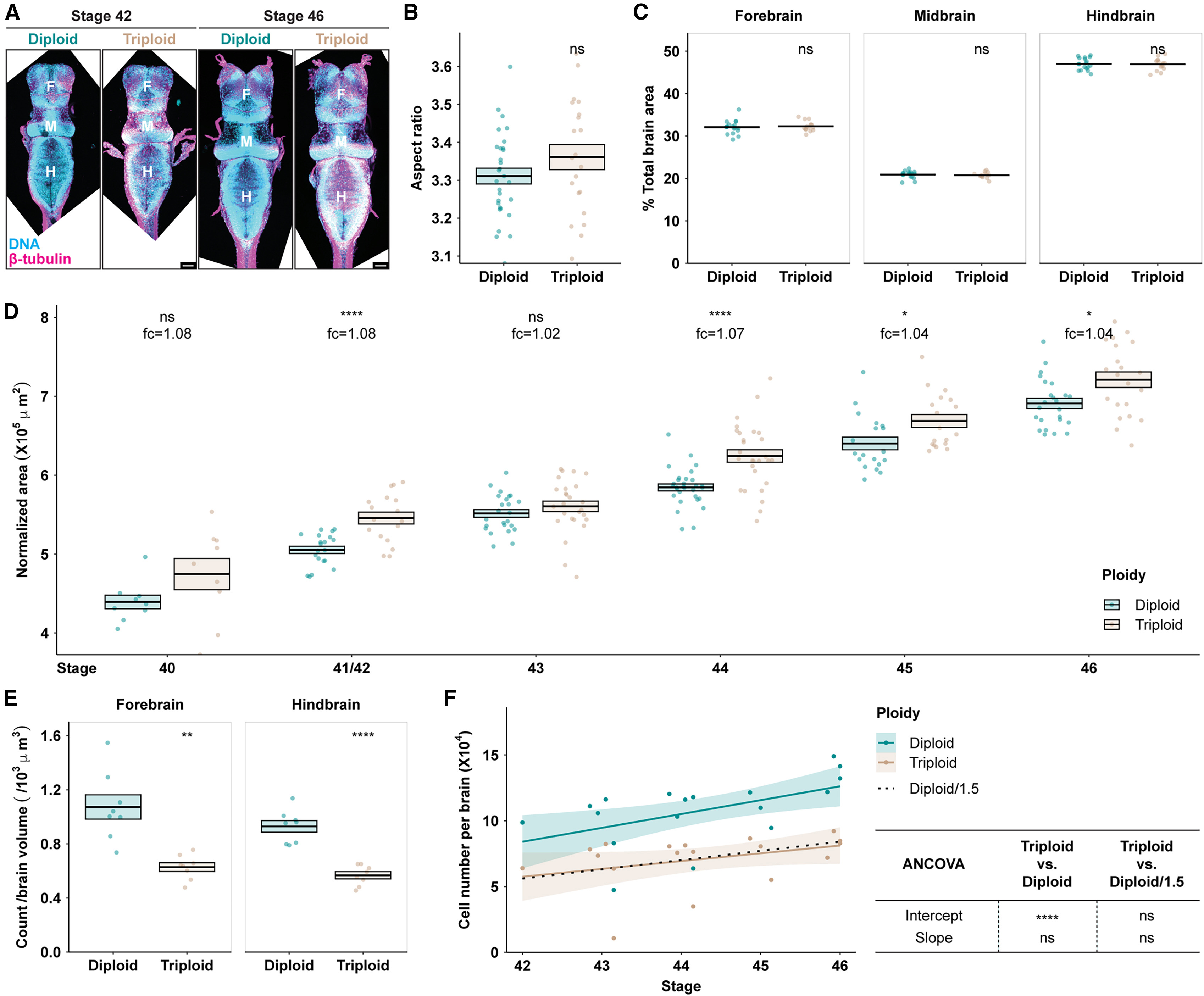 (A) Representative z-projected micrographs of diploid and triploid brains at the indicated developmental stages. Stage 46 images were stitched from two overlapping tiles. F, forebrain; M, midbrain; H, hindbrain. Scale bars, 100[[micrometers]].
