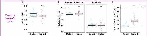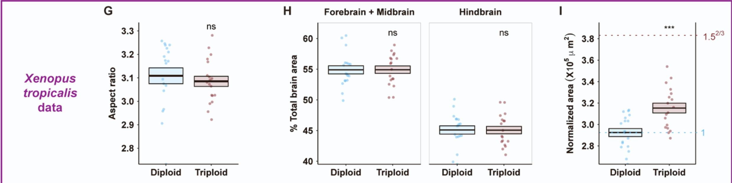 Figure S3. Triploid brains are morphologically similar to diploid brains [[Panels G-I]] Comparisons of the aspect ratio (G), proportion of different brain regions (H), and normalized area (I) of diploid and triploid X. tropicalis brains at stage 46. 18 brains per ploidy from 3 independent clutches were examined.