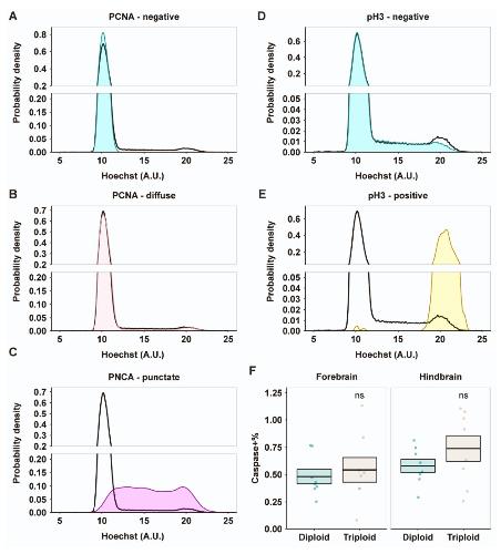 (A–E) Probability density distributions of Hoechst intensity of the three different PCNA populations (A–C) and the two different pH3 populations (D–E) in a representative flow cytometry sample of dissociated brain cells at developmental stage 46. Colored curves show the distribution of the indicated population and black curves