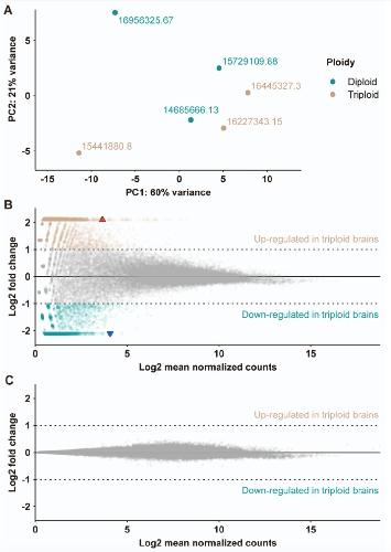 (B) Mean-Average (MA) plot showing log2 fold changes (triploid/diploid) of gene expression in tadpole brains
