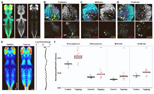 (E) Heatmap showing normalized, averaged pERK/ERK intensity of 15 control brains and 17 brains of tadpoles after 15 min of dish tapping. Stage 46 diploid tadpoles from 3 independent clutches were used. Log2 fold changes (tapping/control) of pERK/ERK intensity along Y axis are plotted to the right. Scale bar, 100[[micrometers]].