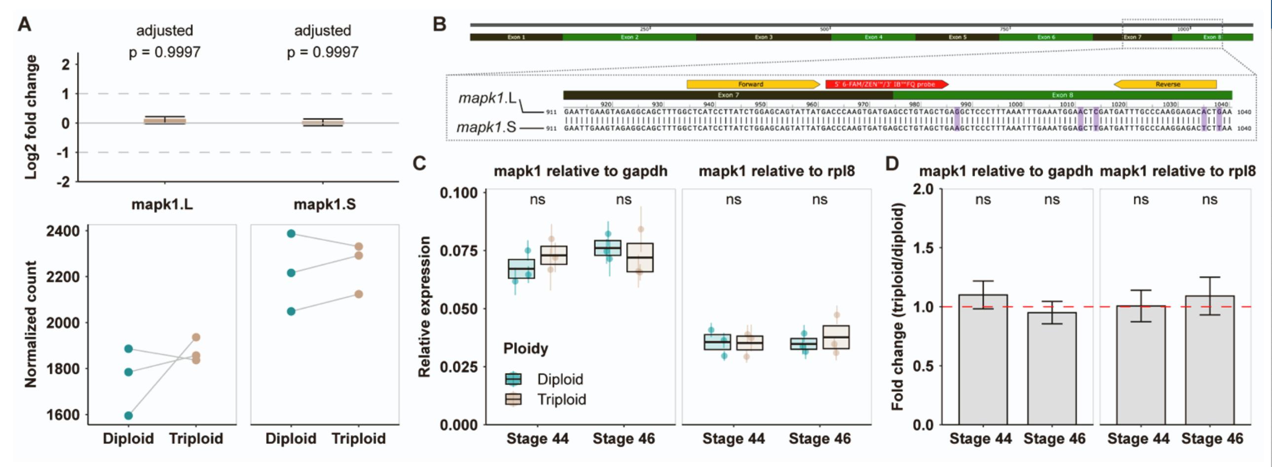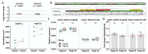 (D) Fold changes (triploids/diploids) of relative mapk1 expression. Error bars denote mean +/- SEM of 3 biological replicates. Red dotted line marks a fold change of 1 (no change). ns, not significant, one sample t test against a mean of 1. |