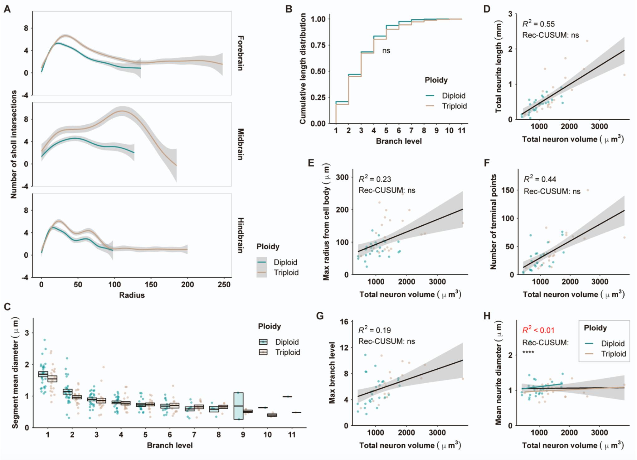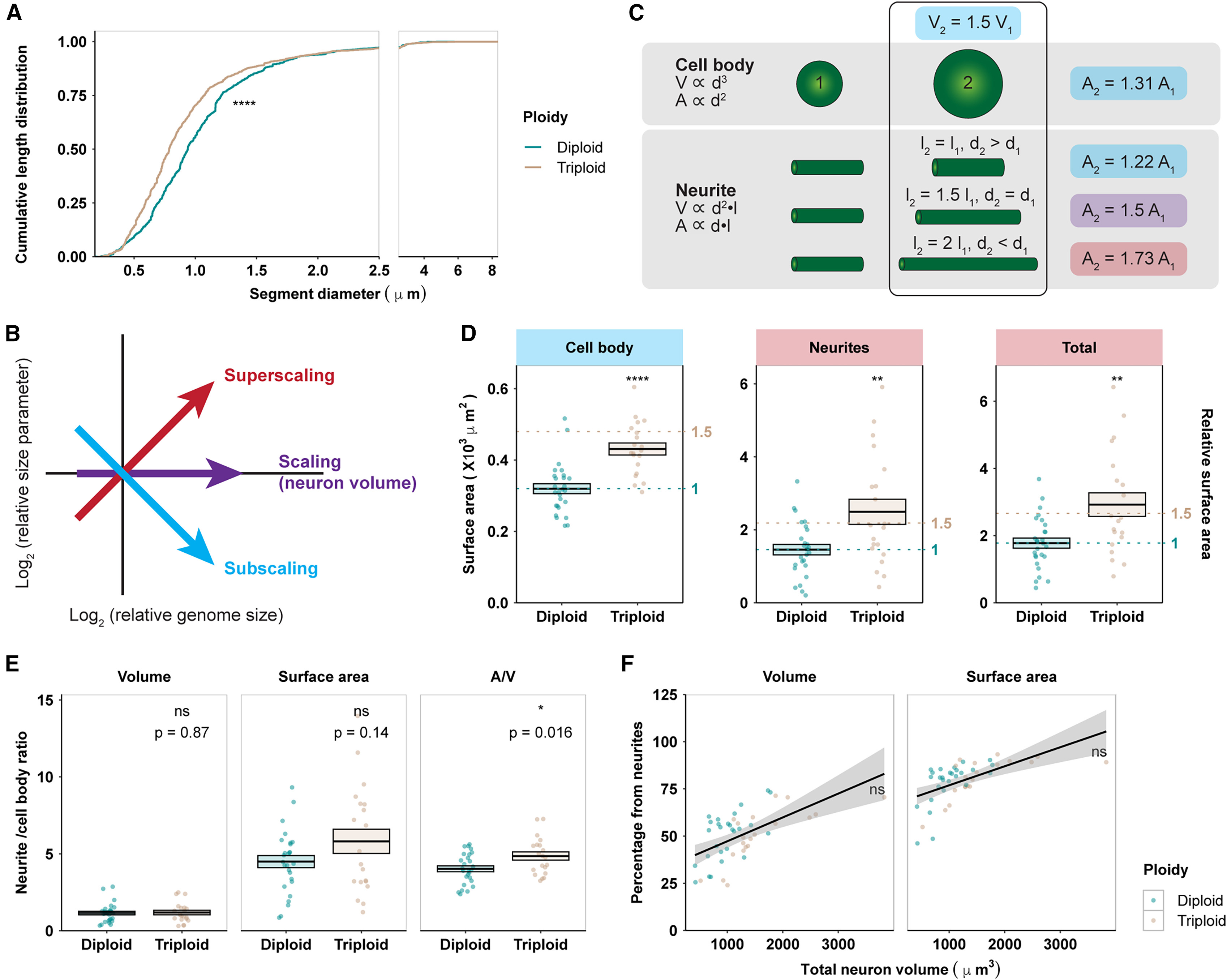 (F) Proportion of neuronal volume and surface area contributed by neurites. Diploid and triploid data were combined, smoothed with a linear model, and presented as the mean +/- 95% confidence interval. ns, not significant, recursive CUSUM test.37