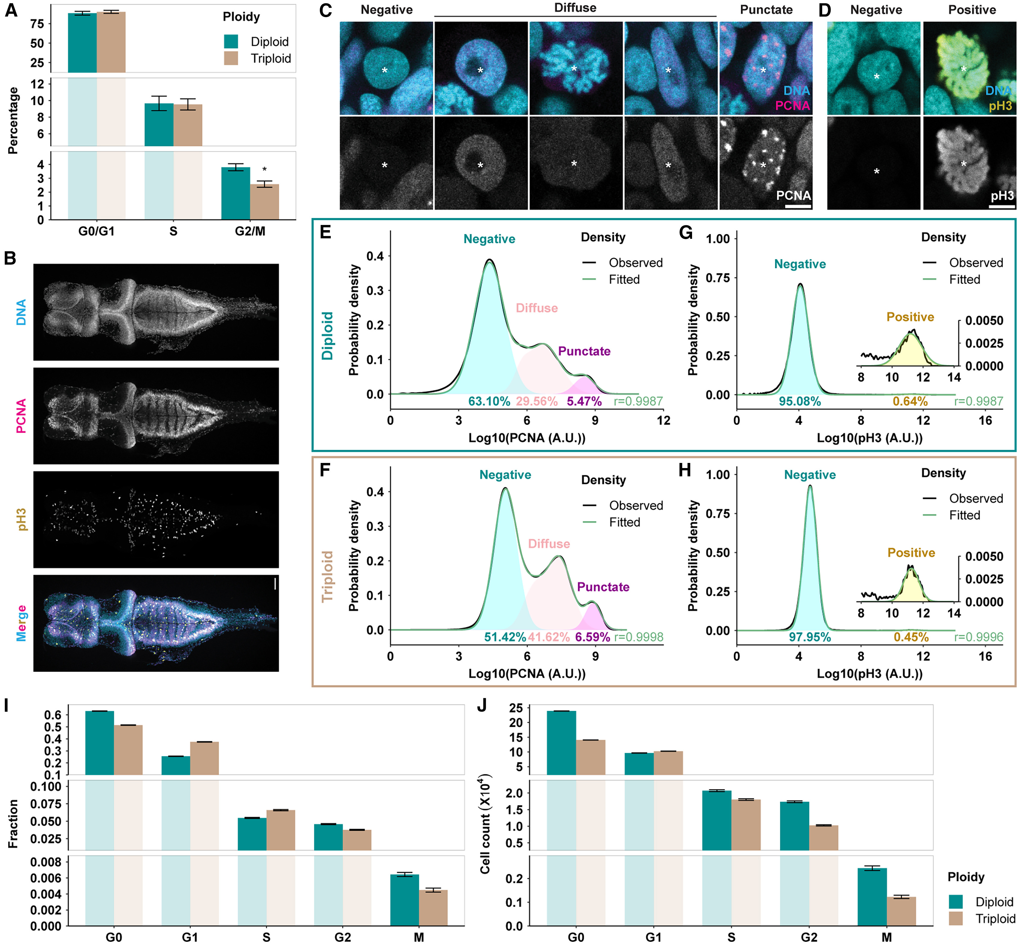 (G and H) Probability density distribution of log10 pH3 level in representative diploid (G) and triploid (H) flow cytometry samples of dissociated brain cells at developmental stage 46. Gaussian distributions were used to fit the two populations as shown in (E). See also Figures S4D and S4E for DNA content distributions of the two pH3 populations.