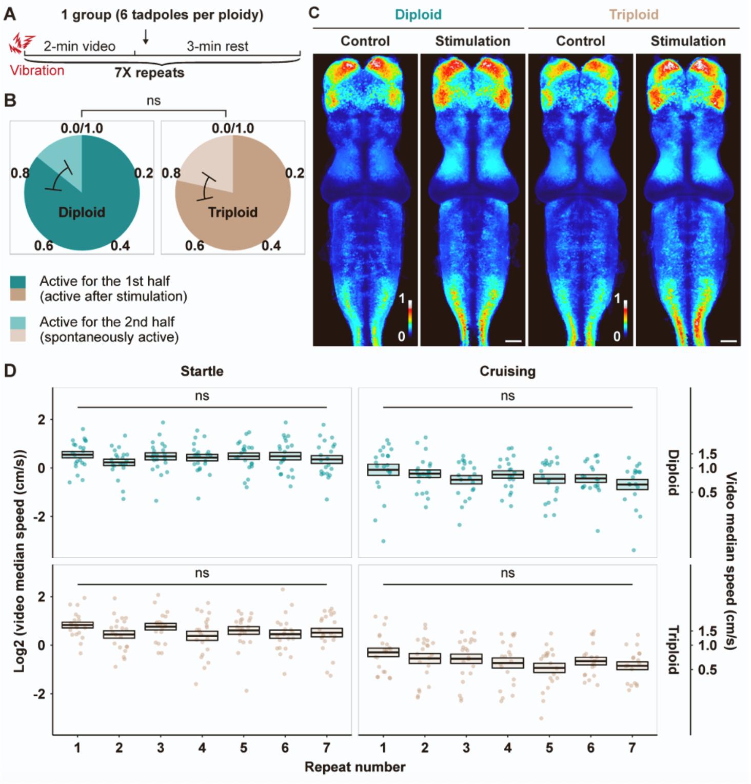(E) Comparison of pERK/ERK intensity in 6-dpf tadpole brains before and after repetitive vibrator stimulation. Telencephalon and diencephalon make up the forebrain. Each dot represents one brain. The numbers of brains examined were 8 for the diploid control group, 8 for the diploid stimulation group, 8 for the triploid control group, and 7 for the triploid stimulation group. Brains were from two independent clutches. Crossbars denote mean +/- SEM. ∗p < 0.05 and ∗∗p < 0.01; ns, not significant; t test. See also Figure S8C for heatmaps corresponding to these data and Table S2 for detailed statistical analysis.