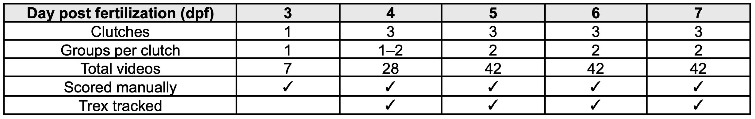 (D) Swimming speeds of tadpoles as they experienced repeated stimulation. Each dot represents the geometric mean of all TRex-tracked speeds in one video. Data from 4–7 dpf were pooled for this analysis. Crossbars denote mean +/- SEM. ns, not significant, ANOVA test. |