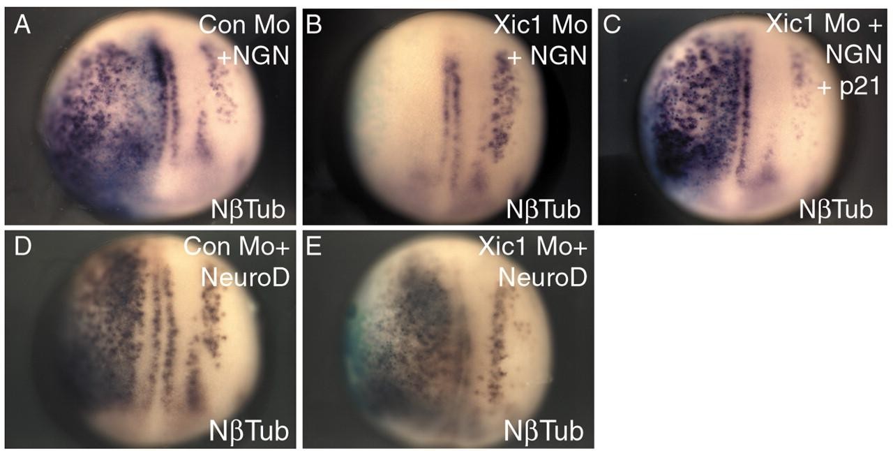 Fig. 4. p27Xic1 acts at an early stage of neurogenesis. Embryos co-injected with 50 pg X-NGNR-1 and 20 ng Con Mo (A) or p27Xic1 Mo (B) were analysed for Nβtub expression (purple) by whole-mount in situ hybridisation, injected side to the left (β-gal, light blue). Co-injection of X-NGNR-1 with Con Mo produces extensive ectopic neurones (A), while p27Xic1 Mo prevents both endogenous and ectopic primary neurogenesis (B). (C) Co-injection of p21Cip1 with X-NGNR-1 rescues downregulation of Nβtub expression by p27Xic1 Mo. Embryos were co-injected with 400 pg NeuroD and 20 ng Con Mo (D) or p27Xic1 Mo (E). NeuroD is able to induce extensive ectopic Nβtub even in the absence of p27Xic1 protein (E).