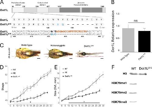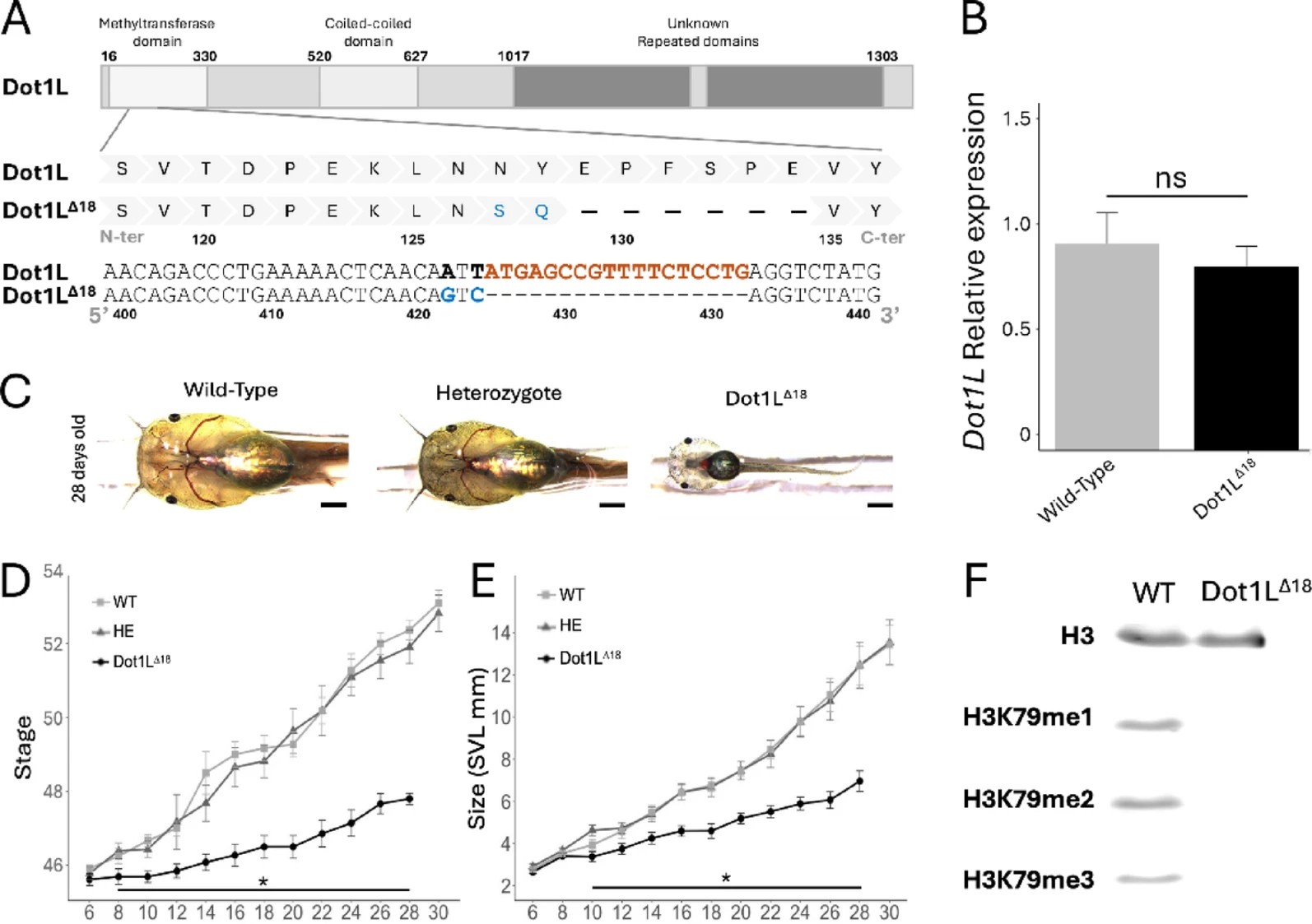 Fig. 1 Dot1L18 mutants show a complete loss of H3K79 methylation. A Schematic representation of the Dot1L18 mutation located in the methyltransferase domain of Dot1L. BThe expression of Dot1L mRNA is not affected by the mutation. Relative expression of Dot1L in wild type (WT) and Dot1L18 tadpoles at stage 48 was measured by qRT-PCR, normalized to that of eIF. Note that no significant difference in Dot1L transcript levels was observed between the two genotypes. C Phenotypic observation at 28 days post-fertilization in WT, heterozygous (HE), and homozygous (Dot1L18) Dot1L18 animals. Twenty animals per genotype were housed individually after genotyping and photographed every 2 days, from day 6 to day 30 to measure the developmental stage (D) or snout-to-Vent (SVL) size (E). Bars represent standard derivations, and stars indicate a significant difference between homozygous Dot1L18 (Dot1L18) and the other two genotypes based on pairwise t-test (p.value<0.05). F Western-blot analysis comparing H3 and methylated H3 in WT and Dot1L18 tadpoles at stage 48 by using antibodies against total H3, H3K79me1, H3K79me2, and H3K79me3. Note that no H3K79 methylation was detectable in Dot1L18 mutants