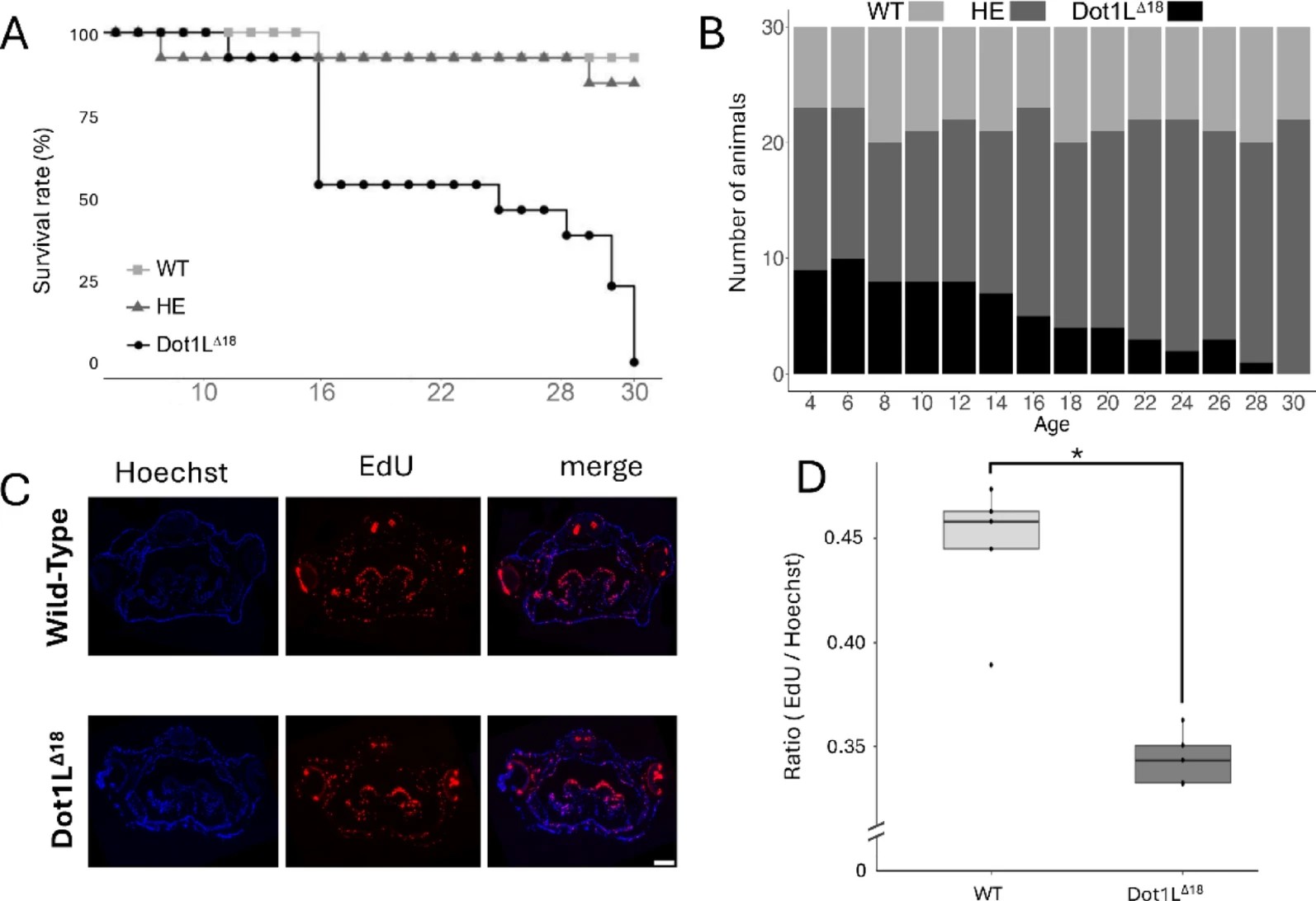 Loss of H3K79 methylation leads to mortality and reduced cell proliferation during X. tropicalis development. A Survival rate of wild type (WT), heterozygous (HE) and homozygous Dot1L18 tadpoles (13 animals per group). A progressive mortality was observed in Dot1L18 mutants from day 16 to day 30 post-fertilization, with no surviving individuals beyond this time point. B Genotype distribution of 30 tadpoles randomly sampled every 2 days from 108 sibling animals generated from mating of two HE adults, housed in a 9-L tank. Note that from day 4 to day 14, the genotype ratio followed Mendelian expectations; however, from day 16 onward, Dot1L18 tadpoles were gradually reduced to 0% by day 30, consisting with independent findings in (A). C Representative images of cell proliferation in the head region (median eye cross-section) of WT and Dot1L18 tadpoles, assessed with 16 h EdU incorporation. D Quantification of EdU-positive cells relative to DNA staining (EdU/Hoechst ratio) in six sections each from two WT and two Dot1L18 tadpoles. A t-test revealed a significant reduction in cell proliferation in Dot1L18 animals compared to WT animals (p.value=0.001213)