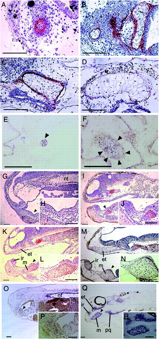 Fig 3. Type II Collagen protein and mRNA expression in the explants and general embryos. The serial sections of the histologically analyzed explants and the sections of general embryos were immunostained with anti-Col2 antibody which was visualized with AEC and counterstained with hematoxylin. The sections of explants and general embryos were hybridized with DIG-labeled Col2 RNA probe, and the localization was visualized with NBT/BCIP. (A) Immunolocalization of Col2 in the serial section of Fig. 2 B, the 4 day-cultured explant. (B) Immunolocalization of Col2 in the serial section of Fig. 2 C, 7 day-cultured explant. (C) Immunolocalization of Col2 in the serial section of Fig. 2 D, 10 day-cultured explant. (D) Immunolocalization of Col2 in the serial section of Fig. 2 F, 14 day-cultured explant. (E) Col2 mRNA expression in the section of 4 day-cultured explant. (F) Col2 mRNA expression in the section of 7 day-cultured explant. (G) Immunolocalization of Col2 in the section of Stage 35 embryo. (H) Higher magnification of the arrowhead indicating area in G. (I) Immunolocalization of Col2 in the section of Stage 40 embryo. (J) Higher magnification of the arrowhead indicating area in I. (K) Immunolocalization of Col2 in the section of Stage 42 embryo. (L) Higher magnification of the arrowhead indicating area in K. (M) Immunolocalization of Col2 in the section of Stage 44 embryo. (N) Higher magnification of the arrowhead indicating area in M. (O) Col2 mRNA expression in the section of Stage 35 embryo. (P) Higher magnification of indicating area in O. (Q) Col2 mRNA expression in the section of Stage 44 embryo. (R) Higher magnification of indicating area in Q. et, ethmoid trabecular cartilage; ir, infrarostralcartilage; m, Meckel's cartilage; nt, notochord; pq, palatoquadratecartilage. (Bars = 50 μm.)