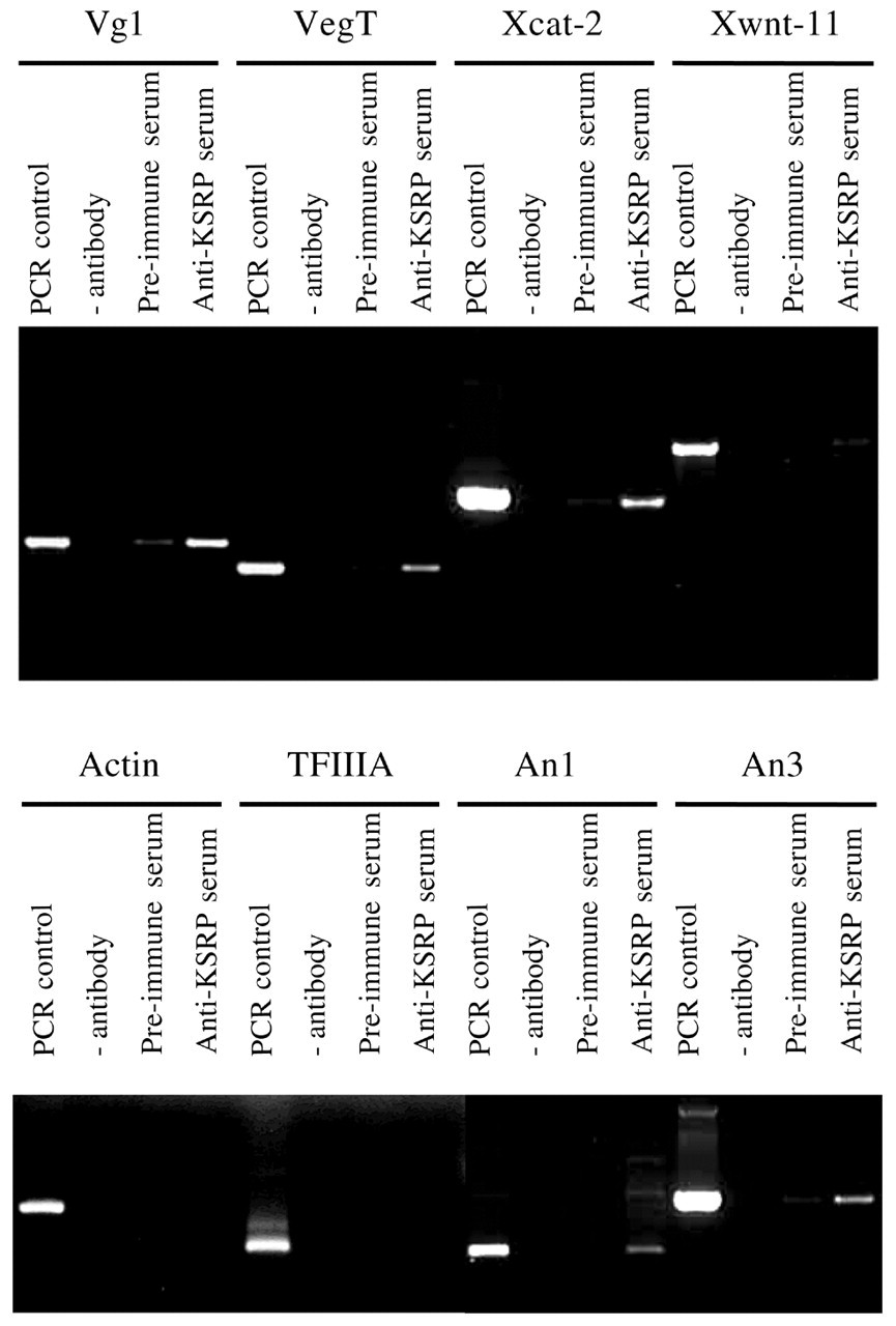 In vivo RNA binding assays. VgRBP71 was immunoprecipitated from whole cell extract. RNA in the precipitate was converted to cDNA by reverse transcription and amplified by PCR using gene-specific primers denoted by the bars above the relevant lanes of the agarose gels. For each mRNA tested, a standard was generated using total oocyte mRNA as the template for RT-PCR (PCR control). Control reactions included precipitation with protein A-Sepharose resin (ntibody) and protein A-Sepharose resin that had been adsorbed with pre-immune serum (Pre-immune serum).