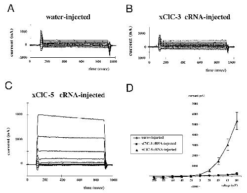 Fig. 2. Electrophysiological properties of IxClC-3 and IxClC-5. Representative traces of currents of (A) water-, (B) xClC-3 cRNA- and (C) xClC-5 cRNA-injected