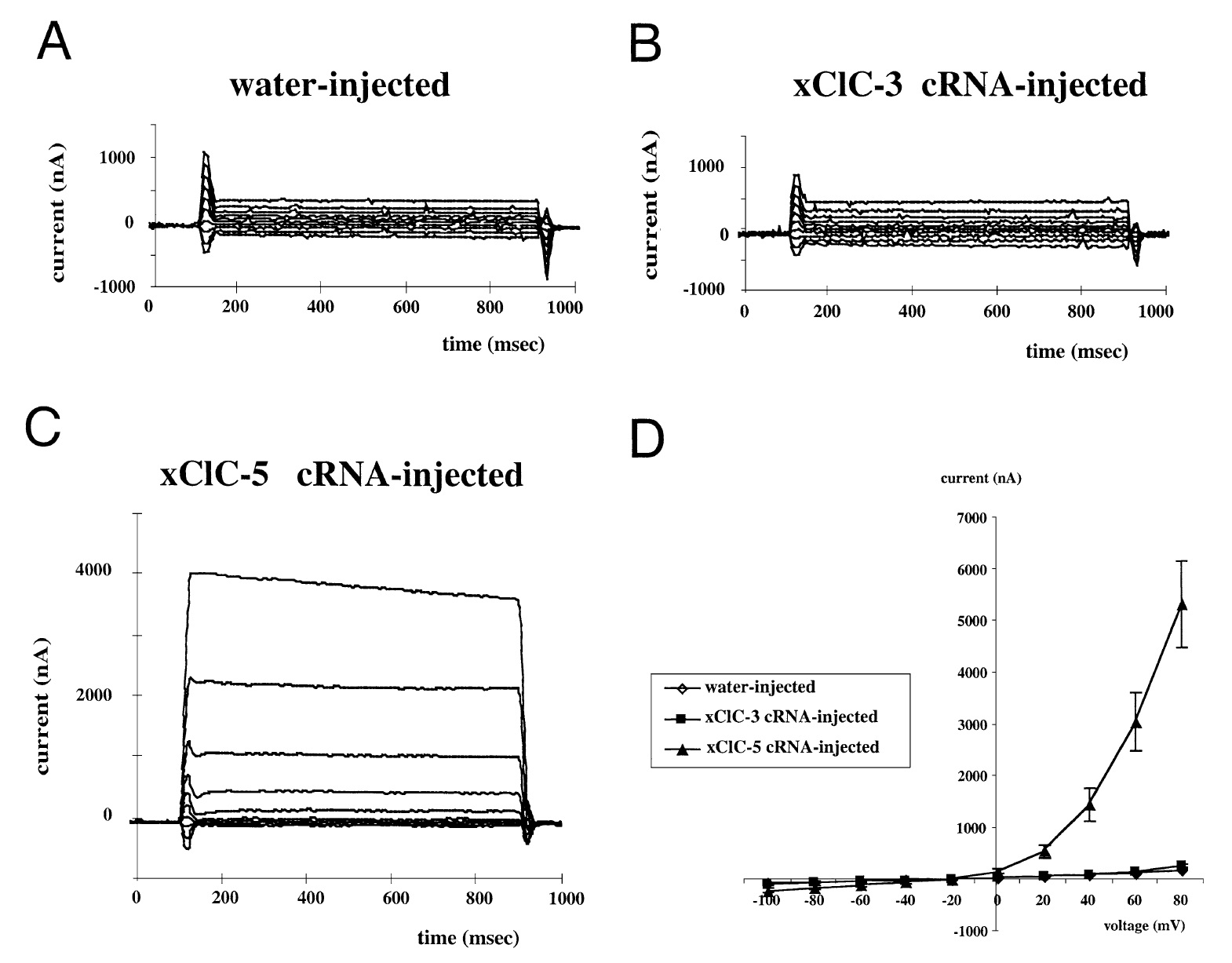 (A) Current/voltage relationships of oocytes expressing xClC-5 under