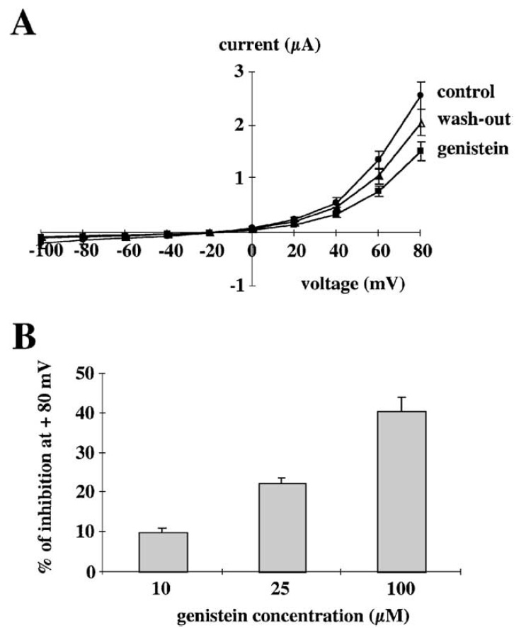 Fig. 4. xClC-5 current is inhibited by the tyrosine kinase inhibitor genistein.