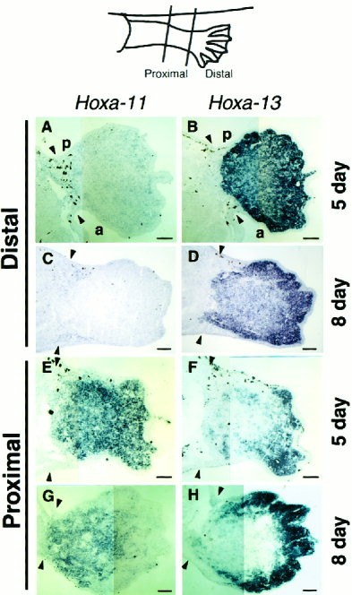 Figure 2. HoxA expressions in recombinants with distal (AâD) and proximal (E,F) mesenchyme. The schematic diagram shows the limb bud at stage 55â56. Solid lines indicate incisions made for the preparation of proximal and distalmesenchyme. Hoxa-11 (A,C,E,G) and Hoxa-13 (B,D,F,H) expressions were examined at 5 days (A,B,E,F) and 8 days (C,D,G,H) after grafting. Arrowheads show the hostâgraft boundary. a, host anterior side; p, host posterior side. Scale bars = 100 μm in AâH.