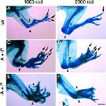 Figure 3. Expressions of shh in recombinants with anterior (A) and posterior (B) mesenchyme. Expression of shh was found only in recombinants with posteriormesenchyme. Arrowheads show the hostâgraft boundary. a, host anterior side; p, host posterior side. Scale bar = 250 μm in B (applies to A,B).