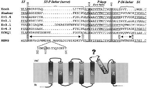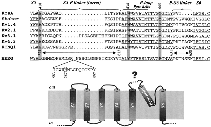 Figure 1. . (Top) Alignment of amino acid sequences from the end of S5 to the beginning of S6 of HERG, major classes of voltage-gated K (Kv) channels, and KcsA. Transmembrane and pore (P)-loop regions are underlined. S5 and S6 correspond to M1 and M2 of KcsA, respectively. S5-P linker (“turret” of KcsA) and P-S6 linker (P-M2 of KcsA) are marked. Gaps (…) are introduced to improve alignment. Amino acids in the Shaker channel implicated in hydrogen bonding and critical for maintaining the outer mouth in the open state are highlighted by gray shade: E418, W434, and Y445 (Shaker position numbers shown on top). Note that these amino acids are conserved in KcsA and all major classes of Kv channels, but not in HERG. The HERG positions examined here (571–613 of S5-P linker, and 631–638 of P-S6 linker) are marked above its sequence. Positions 583–597 are shown as an insert. H587 in HERG is circled (see text for discussion). (Bottom) Transmembrane topology of one Kv channel subunit. The structure of the unusually long extracellular S5-P linker of HERG (marked by a dotted line and “?”) is the major focus of this study. |