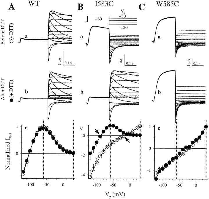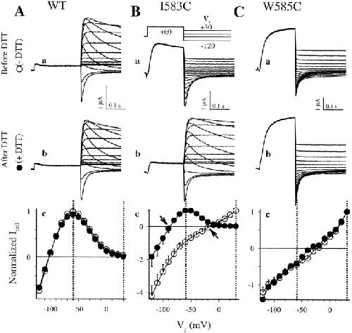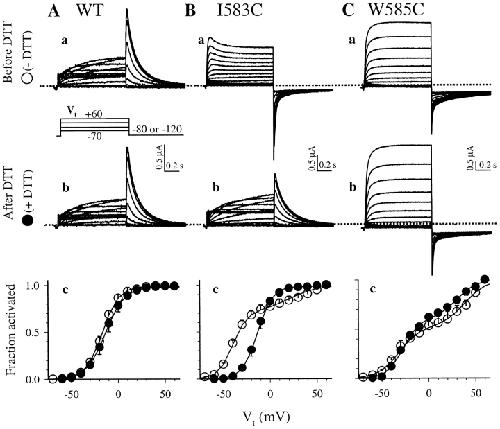 Figure 5. . Effects of cysteine substitution at positions 583 and 585 on the voltage dependence of activation. The voltage clamp protocol is shown in the middle of column A. Superimposed original current traces recorded before DTT treatment (panels a), and after DTT treatment (panels b) from the same oocytes are depicted. Dotted lines denote the zero current level. Panels c illustrate 1-s isochronal activation curves averaged from 5–7 oocytes per group. For each oocyte, tail current amplitudes after depolarization to different levels of Vt are measured and normalized by the maximal tail current after Vt to 60 mV. This gives an estimate of the fraction of channels activated at the end of Vt. The relationship between Vt and “fraction activated” is fit with a single (WT, and I583C after DTT) or double (I583C before DTT, and W585C before/after DTT) Boltzmann function: Fraction activated = A1/{1 + exp[(V1 − Vt)k1]} + A2/{1 + exp[(V2 − Vt)/k2]}, where Ai, Vi, and ki are the fraction, half-maximum activation voltage and slope factor of ith Boltzmann component. For single Boltzmann function, i = 1 only. The superimposed activation curves are calculated from appropriate Boltzmann function with mean parameter values. |